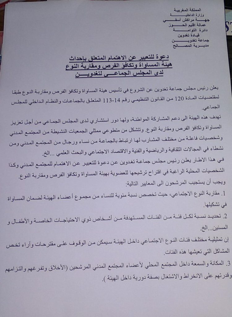 دعوة للتعبير عن الاهتمام المتعلق باحداث هيئة المساواة وتكافؤ الفرص و مقاربة النوع -جماعة تغدوين -اقليم الحوز.