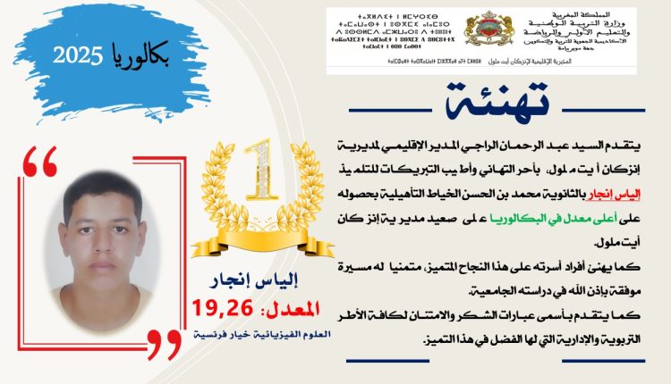 التلميذ” إنجار الياس ” يحقق أعلى معدل في امتحانات البكالوريابمديريةالتعليم إنزگان ايت ملول: