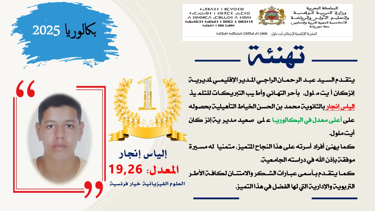 وبهذا الإنجاز المتميز يتقدم المدير الإقليميا الأستاذ عبد الرحمان الراجي،بأحرالتهاني وأطيب التبريكات للتلميذ *إنجار الياس*،كما يهنئ أفراد أسرته على هذا التفوق المتميز، متمنيا له مسيرة موفقةفي مساره الدراسي والمهني،كما يتقدم بأسمى عبارات الشكر لكافة الأطر التربوية والإدارية التي لها الفضل بهذا التميز.