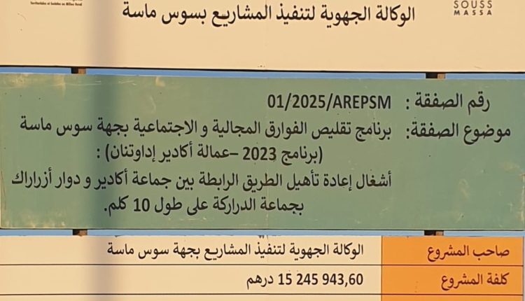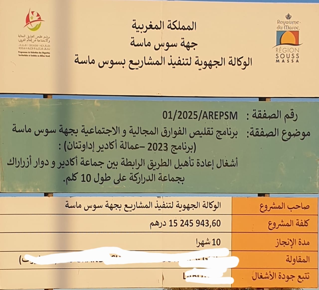 المفارقة الصادمة، حسب ما تشير إليه لوحة المشروع المثبتة بعين المكان، أن كلفة إنجاز هذه الطريق تناهز 15 مليون درهم، مع تحديد مدة إنجاز لا تتجاوز 10 أشهر، وإسناد الأشغال إلى شركة معروفة، تحت إشراف الوكالة الجهوية لتنفيذ المشاريع بجهة سوس ماسة، غير أن الواقع الميداني يكشف عن فجوة صارخة بين ما هو معلن على الورق وما هو منجز فعليًا على الأرض.