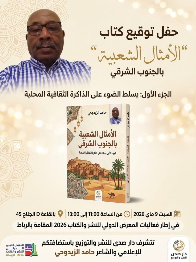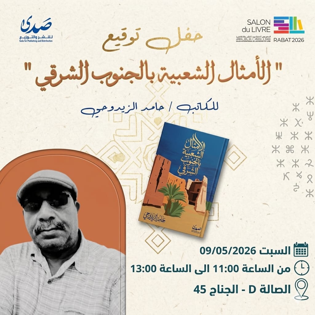 في إطار فعاليات المعرض الدولي للنشر والكتاب 2026 المقام بالرباط تحتضن دار صدى للنشر والتوزيع حفل توقيع كتاب “الأمثال الشعبية بالجنوب الشرقي” للكاتب حامد الزيدوحي وذلك يوم السبت 9 ماي 2026 بمشيئة الله من الساعة 11:00 إلى 13:00، بالقاعة D الجناح 45.