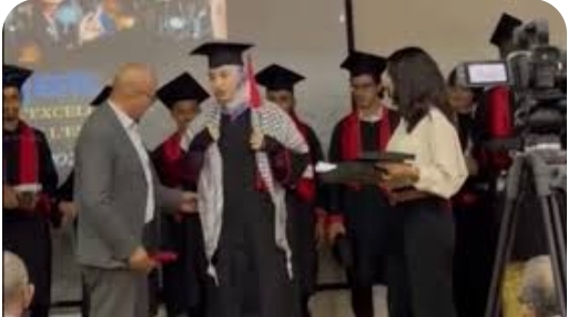 جدير بالذكر أن العميد المذكور حاول نزع كوفية فلسطينية من على صدر طالبة في حفل التخرج .
