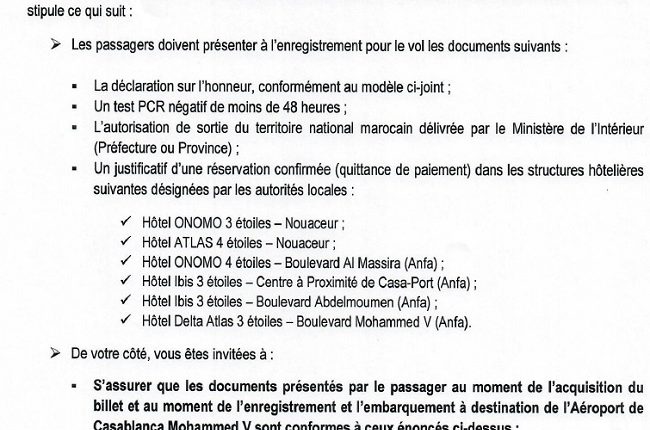 La procédure prévoit dix jours de quarantaine à Casablanca dans l’un des 6 hôtels figurant sur une liste jointe à la circulaire ; ainsi qu’un test PCR négatif datant de moins de 48 heures. Pour les hôtels, on ne se contentera pas d’une réservation : une quittance de paiement sera exigée. Surtout, l’autorisation de sortie du territoire national, délivrée par la préfecture ou la province, et qui a été utilisée pour quitter le Maroc, sera exigée au retour.