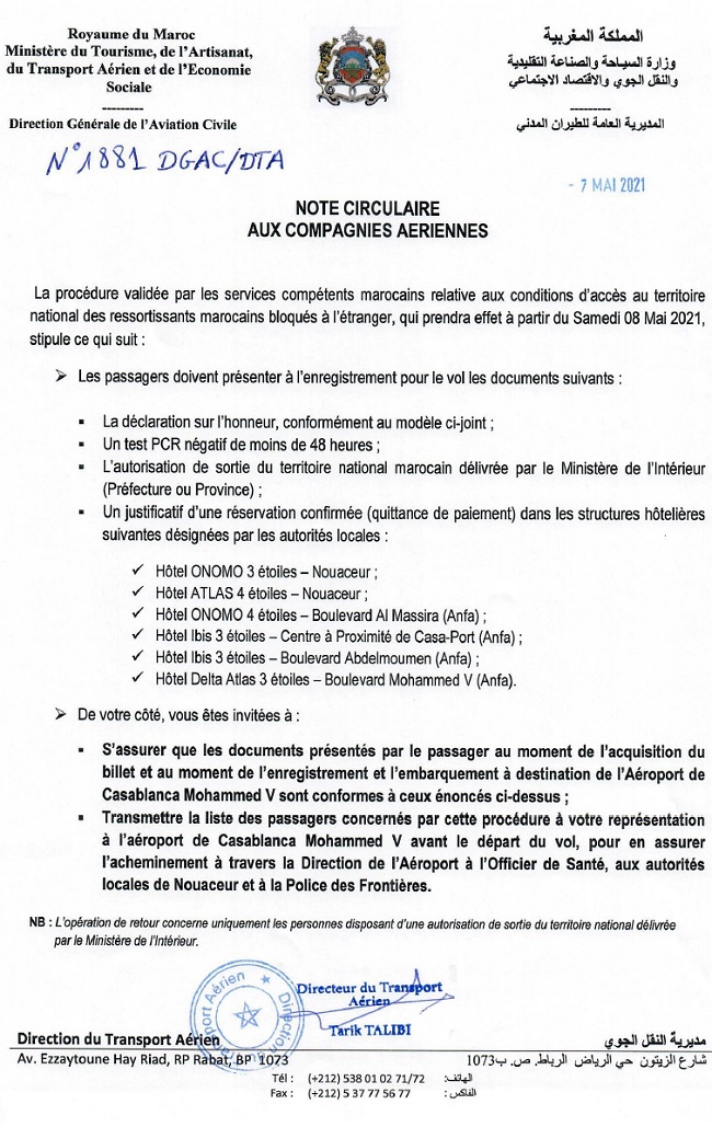 La Direction générale de l’aviation civile (DGAC) relevant du ministère du tourisme et du Transport aérien, a adressé aux compagnies aériennes, ce vendredi 7 mai une note circulaire définissant “les conditions d’accès au territoire national des ressortissants marocains bloqués à l’étranger, qui prendra effet à partir de ce samedi 8 mai“.